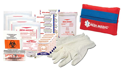 Contents: (1) nylon case, (10) plastic bandages, (5) antiseptic wipes, (6) 4"x4" sterile gauze pads, (1) 4" sterile pressure bandage, (1) triangular bandage, (2) safety pins, (1) bio-hazard bag, (1) pair of latex gloves, (1) 1"x2.5yd roll of tape