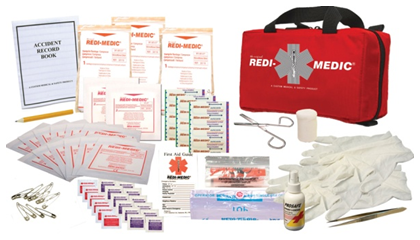 Contents: (1) nylon case, (1) 4" scissors, (1) 4 1/2" forceps, (1) first aid booklet, (12) cloth bandages, (12) antiseptic swabs, (2) 4"X4" sterile gauze pads, (12) 3" x 3" sterile gauze pads, (1) 2" x 5yd conform gauze rolls, (3) triangular bandages, (12) safety pins, (1) 1"x2.5yd. roll of adhesive tape, (4) pairs of latex gloves, (1) bio-hazard bag, (1) CPR mask with one way valve, (1) accident report book, (1) pencil, (1) pen, (6) wet wipes, (1) first aid spray