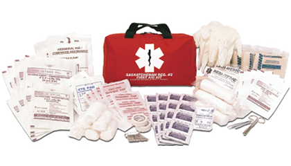 Contents: (1) water resistant nylon container, (1) 4" kit scissors, (1) 3" kit tweezers, (24) bandaids (3/4"x3"), (20) antiseptic swabs, (1) small bar of soap, (4) 2"x2" sterile gauze pads, (4) 3"x3" sterile gauze pads, (4) 4"x4" sterile gauze pads, (2) 5"x9" sterile ABD, (2) sterile eye pads, (2) 4" sterile pressure bandage, (6) 2"x5yd. conform roll, (6) 4"x5yd. conform roll, (4) triangular bandages, (16) safety pins, (2) 0.5"x2.5yd. roll of adhesive tape, (1) CPR mask with one way valve, (2) pair of latex gloves